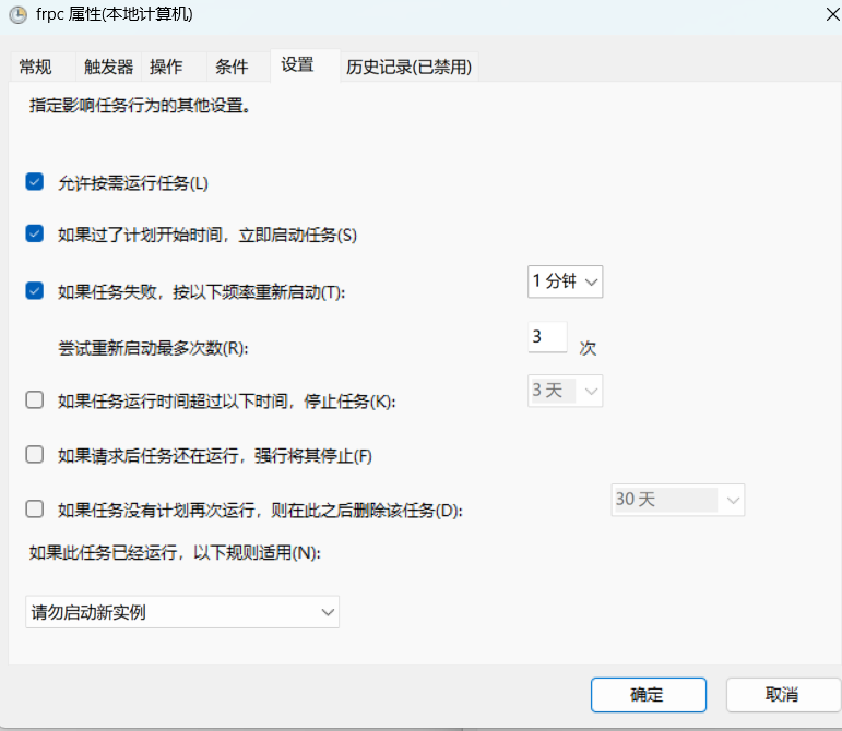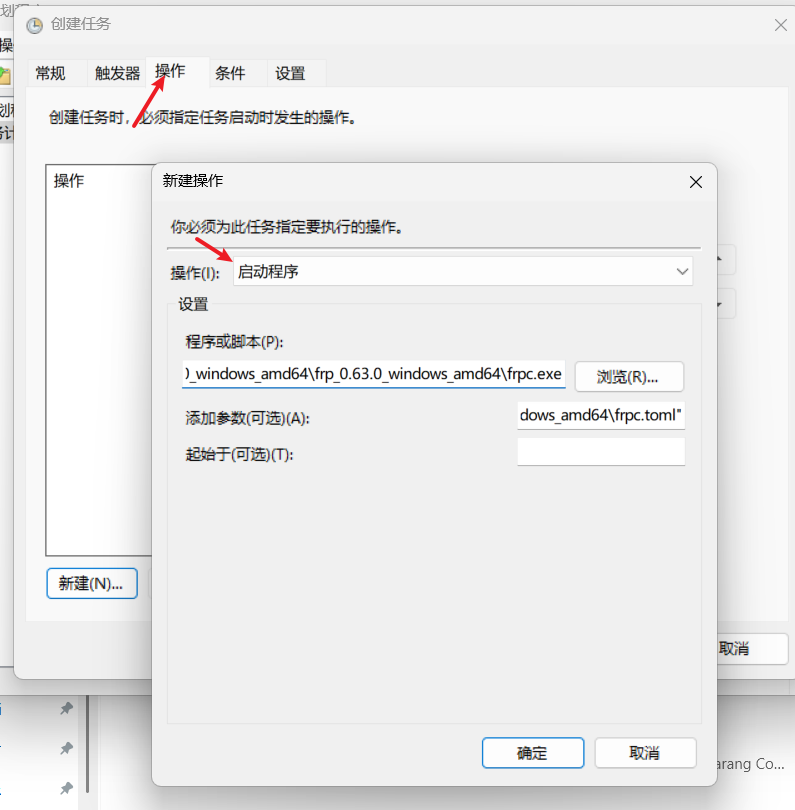 frpc.exe,比如:D:\program\frp_0.63.0_windows_amd64\frp_0.63.0_windows_amd64\frpc.exe - 在“添加参数”里填入: