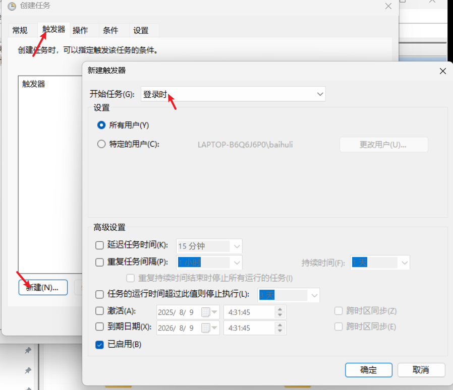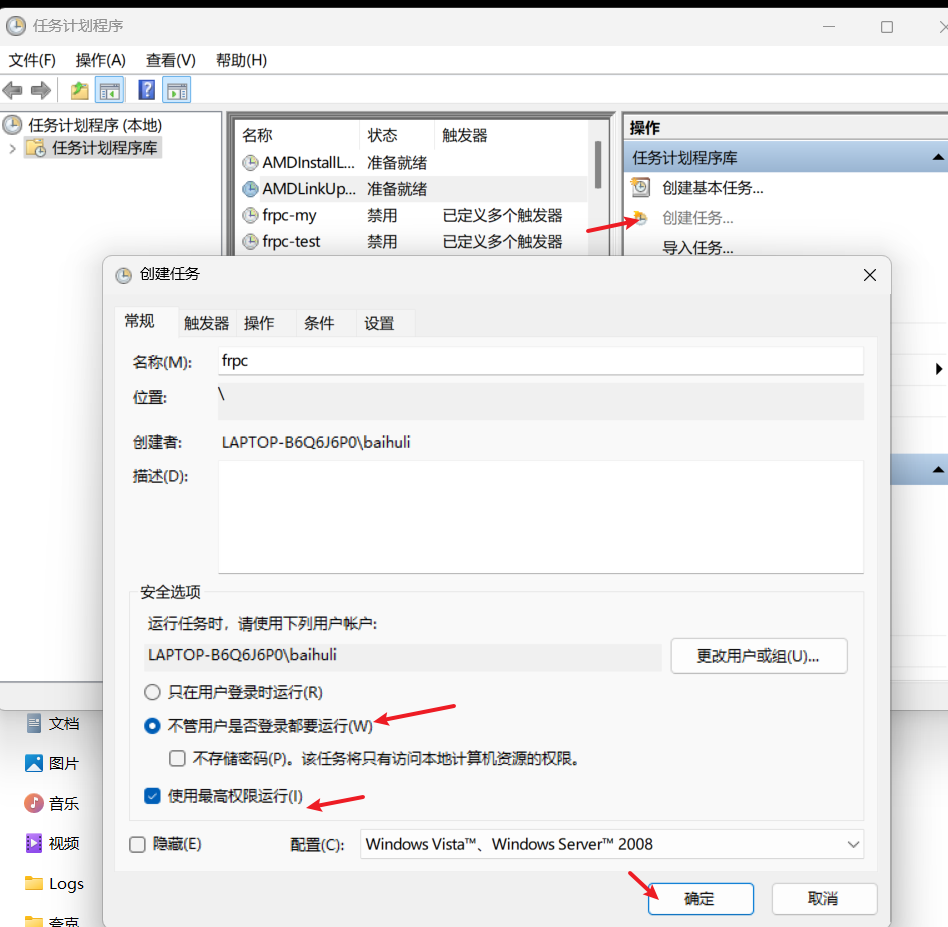 计划任务功能创建任务,勾选不管用户是否登录都要运行以及使用最高权限运行